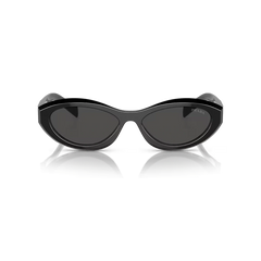 The Prada PR 26ZS 16K08Z sunglasses feature a trendy irregular-shaped black acetate frame for women. They are fitted with dark grey polyamide bio lenses that provide clear vision and UV protection. Made in Italy, these sunglasses combine luxury and modern style, perfect for elevating everyday fashion.