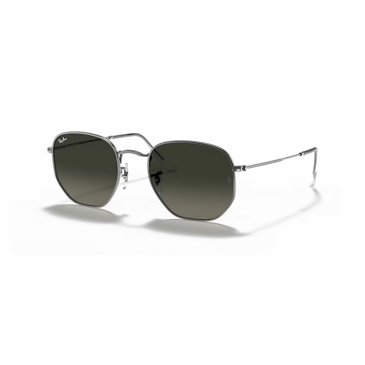 The Ray-Ban RB3548N 004/71 sunglasses feature a distinctive irregular hexagonal polished gunmetal metal frame. They are fitted with grey gradient lenses that provide clear vision and reliable UV protection. With adjustable nose pads and a modern geometric design, these sunglasses offer both comfort and standout style.