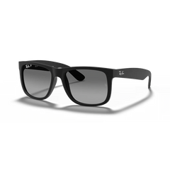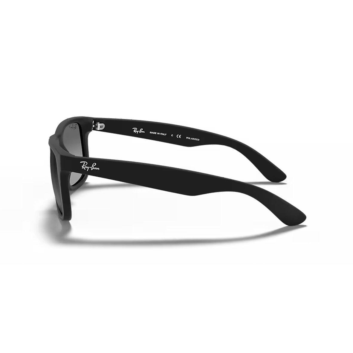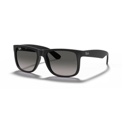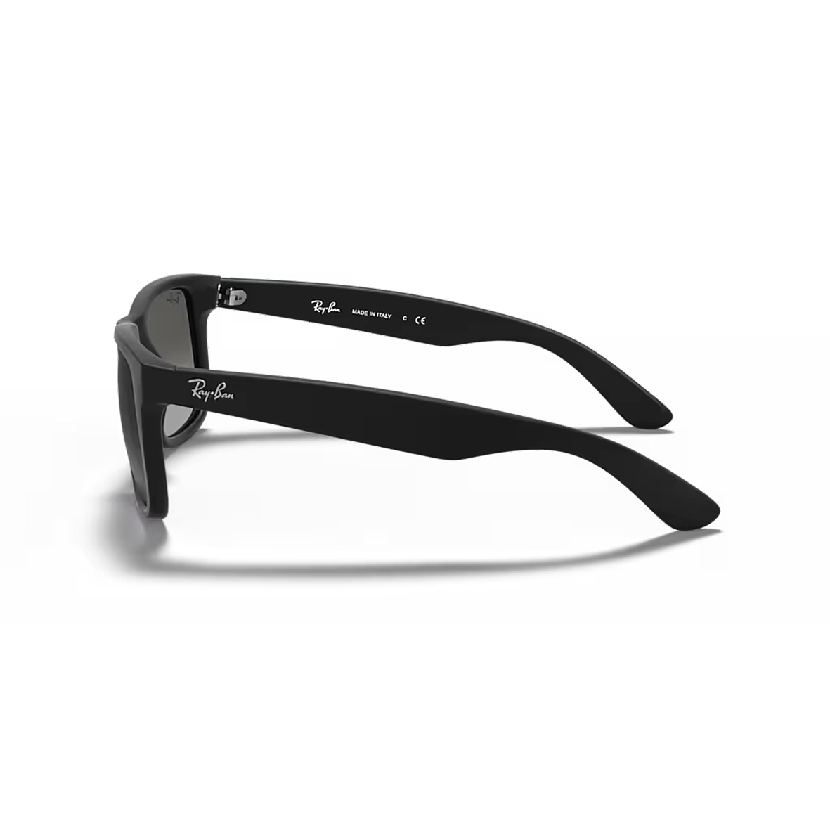 The Ray-Ban RB4165 601/8G Justin Classic sunglasses feature a bold square-shaped black rubber nylon frame. They are fitted with dark grey gradient polycarbonate lenses that ensure clear vision and UV protection. Inspired by the iconic Wayfarer design, the Justin Classic offers a modern, stylish, and comfortable look for everyday wear.